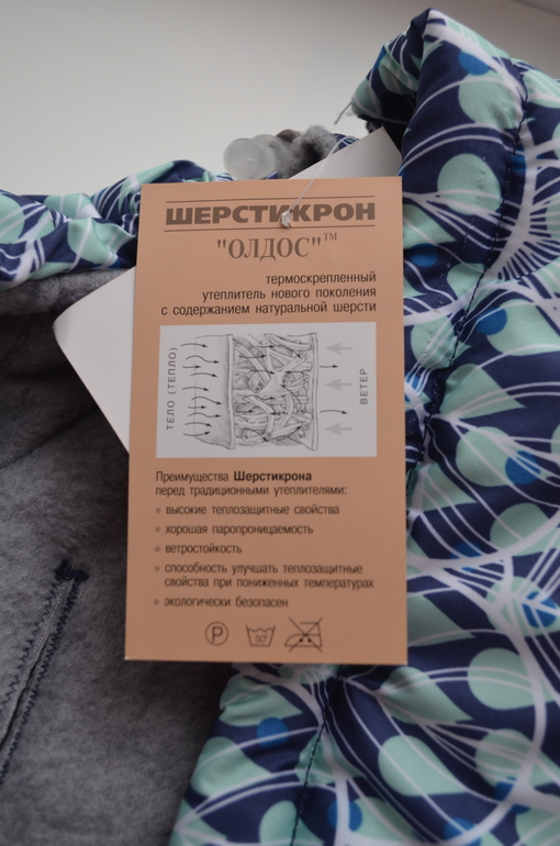Верхняя ткань - полиэстер, который обладает водоотталкивающими свойствами. Утеплитель в конверте - шерстикрон с содержанием натуральной шерсти (50% овечья шерсть, 50% пэ). На передней части конверта утеплитель шестикрон - 300 г/м2, на задней - пэ 200 г/м2.