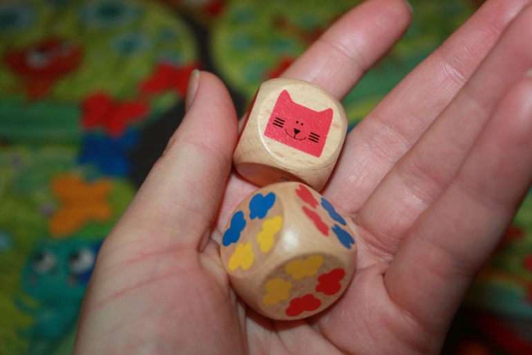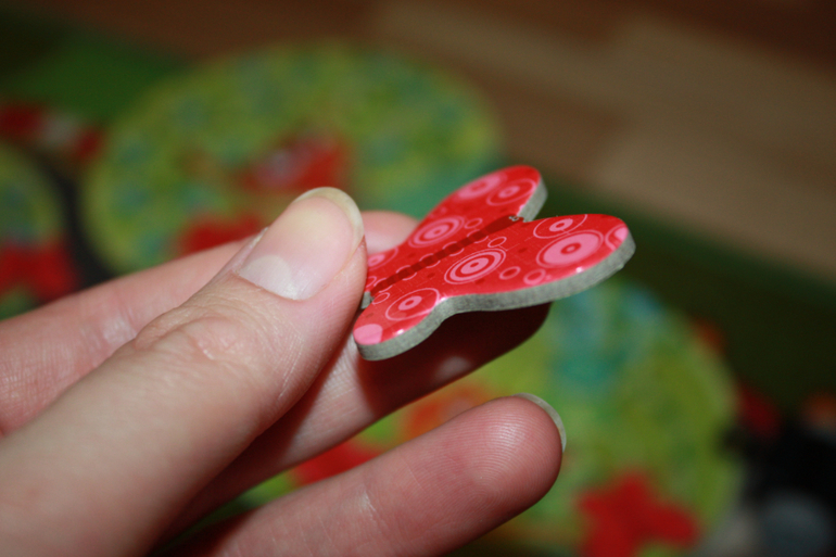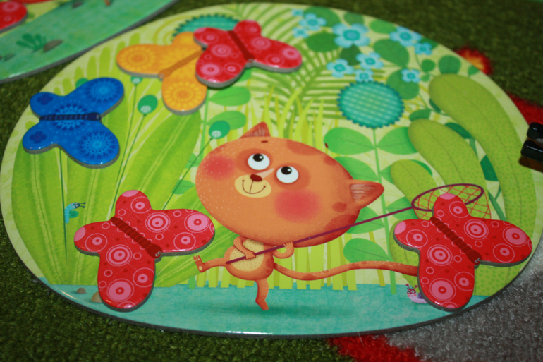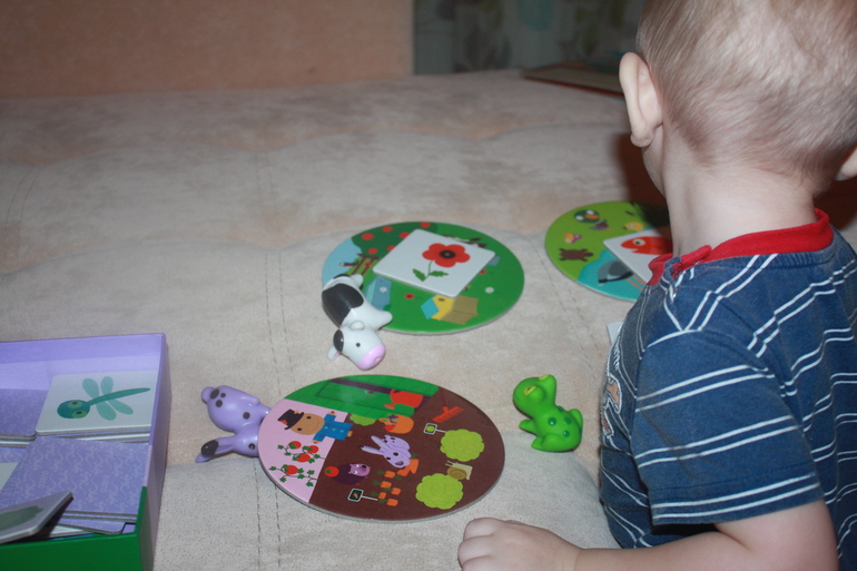 иногда достаёт Djeco Minimi. Играем разумеется не по правилам, просто бросает кубики и раскладывает бабочек. делим их по цветам(пытаемся).