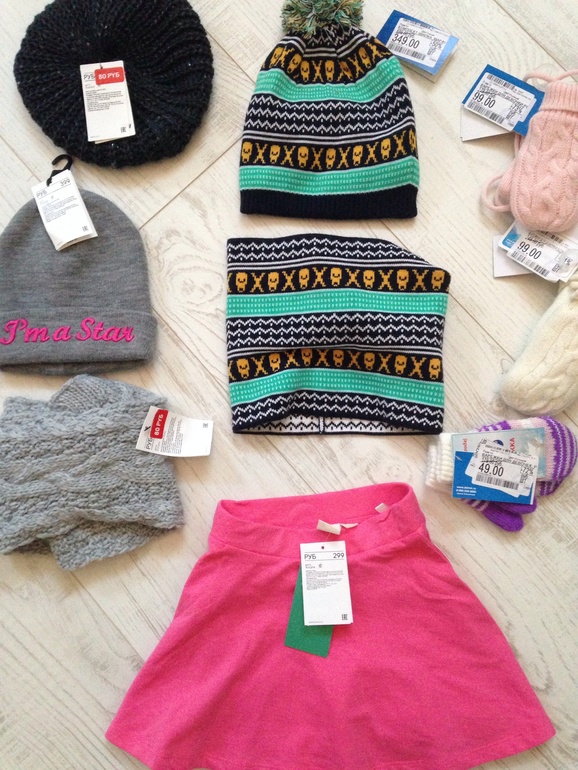Из h&m двойной беретик с пайетками и шарфик по 80 р, шапочка 399 и юбочка 299.