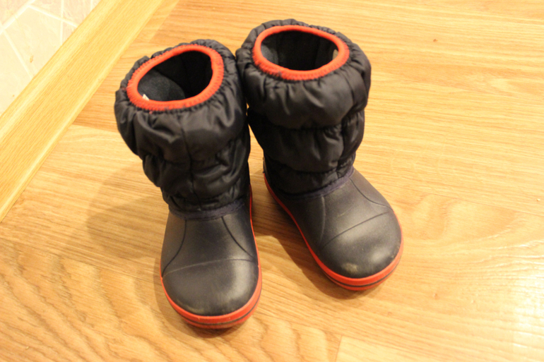 Дутики Крокс. Надевали пока всего пару раз. Очень легкие и удобные. У меня у самой такие же, хожу как в тапочках. Конечно они куплены на более сухую погоду и на плюсовую температуру. Несмотря на отсутствие каких-либо застежек, легко надеваются на ножку. Скользят конечно, не для снега они. Но я ими довольна, смотрятся классно)