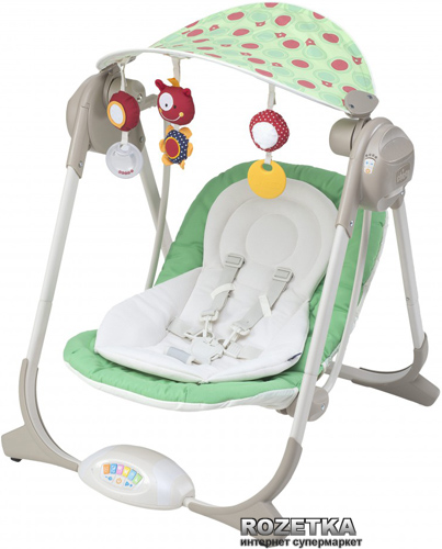 Мы тоже выбирали между шезлонгом и качелей, в итоге выбрали 2 в одном, качели с отстегивающимся сидением фирмы SIGMA. Чем удобны качели тем, что можно катать ребенка и укачивать его, здесь есть тоже механизм само укачивания ( рыбка издает мелодию и качает), + можно отстегнуть и будет сидение для ребенка