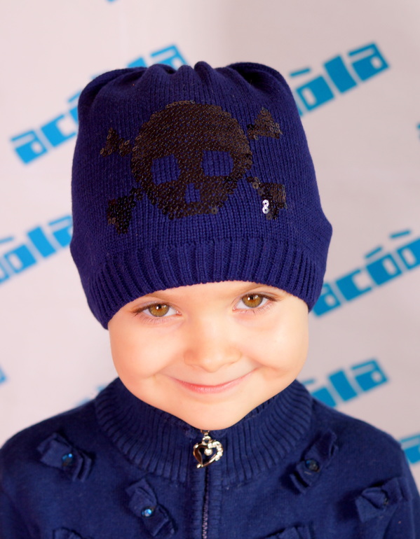 Наши бабушки эту шапку не оценили и назвали мальчуковой) Даше же она нравится тем, что "очень мягкая", ну а меня почему-то жутко прикалывает черепушка в пайетках)