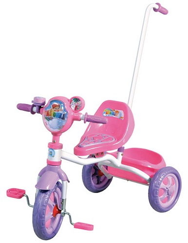 Нам подарили очень похож на ваш, но есть подставка под ножки и ручка управляет передник колесом. Покупали дарители в детском Мире. При росте 82 см еще до педалей плохо достает. Легкий это да, но не очень устойчивый. А насчет ручки, когда сами ребенка катаете, то порой удобнее везти его поднимая вообще переднее колесо. Но повторюсь у нас не такой фирмы.