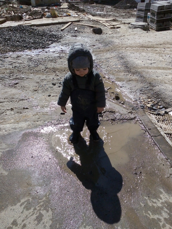 Наш улов - три лужи и ежедневная грязь от соседней стройки. Штаны рыбака испытания прошли. Будет измерять лужи и дальше.