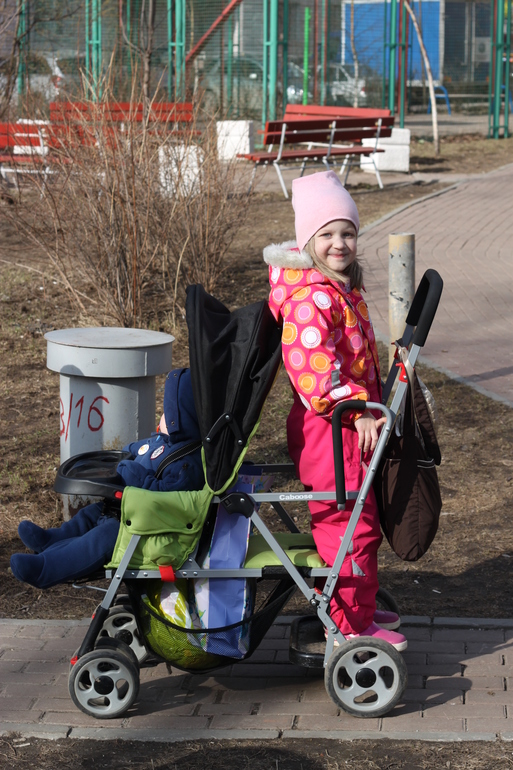 5. Коляска едет неожиданно легко для двойной! Но мне легче, когда дочка стоит на подножке. Но и вес у дочки уже 20 кг.