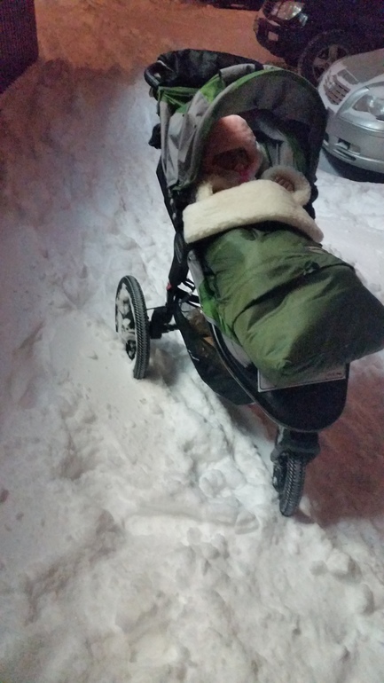 Вот и наконец-то пришли холода и выпали первые сугробы. В сугробах коляска проходит с небольшими усилиями. Что касается застреваний, то застревает только там, где не пройти, ни проехать даже на санках =) На зиму купили конверт. Удлиненный. В местном магазина Дочки-сыночки. Цена в пределах 2500 . Остались довольны =)