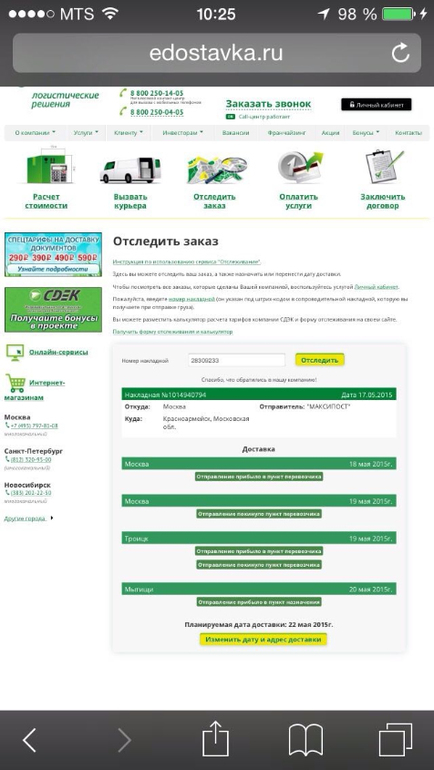 Захожу на сайт СДЭК, смотрю, а они мне дату доставки на 25.05.2015 поставили (мне при этом никто не звонил и не предупреждал).