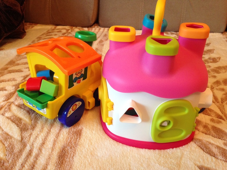 Паровозик сортер от Полесье и домик Smoby. К обеим игрушкам в течении дня обращается, паравозик больше катает, а домик использует, как сортер. В домике еще предусмотрены ключи от дверей, эта функция у нас совершенно не востребована, тк ключи вставляются не удобно, и не понятно открыл ты дверцу или нет.