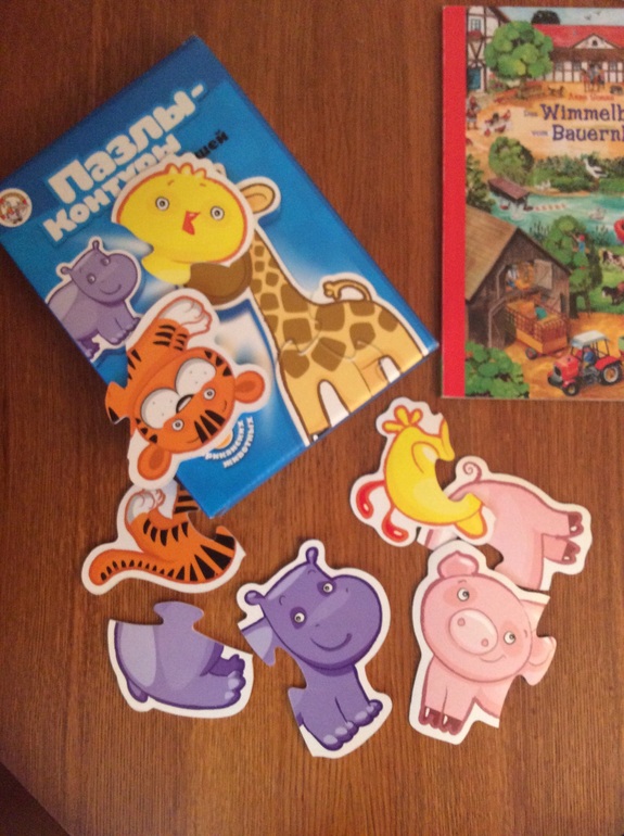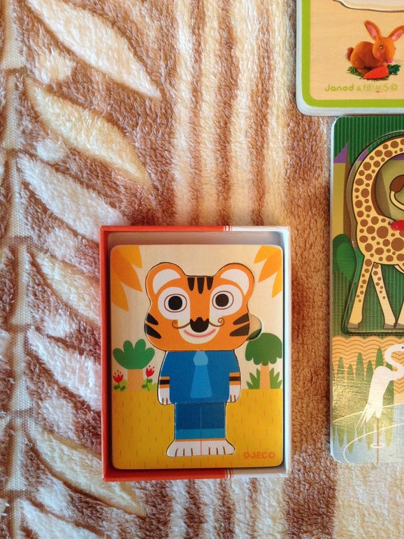 Трех слойный пазл Тигр, кстати в отличит от предыдущих трех он ее действительно заинтересовал и она его собирает сама уже.