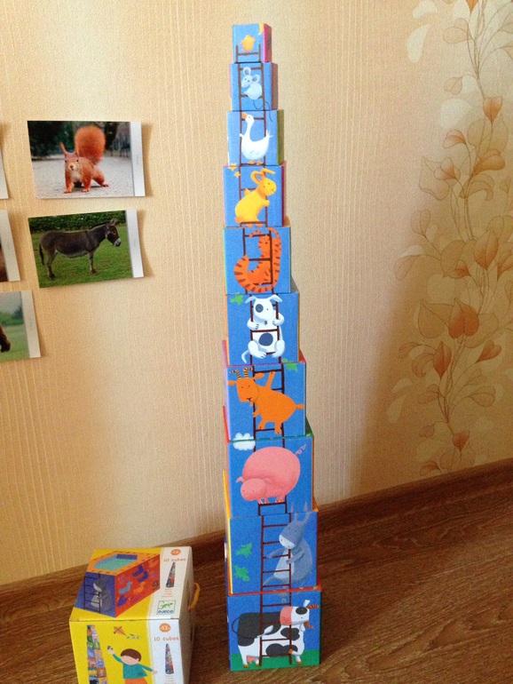 Кубики есть мягкие от Мякиш, долго играли и были востребованы, поэтому решила взять им в пару картонные от Djeco. Играем каждый день, но больше строит и ломает, показывает животных, самый маленький кубик-самый любимый.