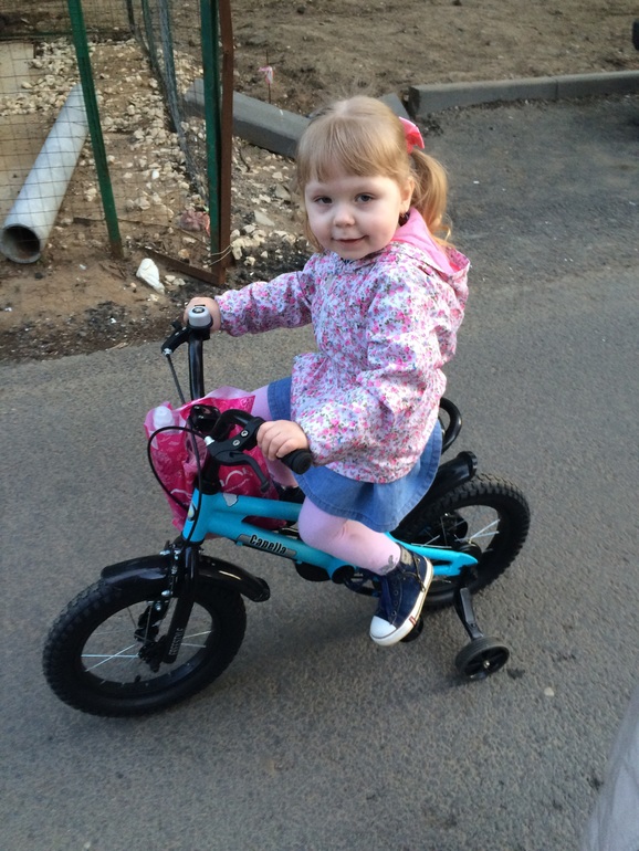 А пока что мы обучаемся езде на велосипеде. Выбор пал на Capella S-14. В целом я им довольна. Прочный, на широких колесах, не очень тяжелый. Но и его, как и многие другие 4-ехколесные велосипеды, не обошла стороной беда неустойчивых боковых колес. Но думаю, что это легко откорректируем (пока не пробовали). Арина покаталась недельку на нем и вернулась к самокату. Рулит она неплохо, но пока не понимает, как крутить педали. Как бы объяснить...Она не прокручивает полный круг двумя ногами, а выжимает вперед правой, тут же прокручивает назад левой и снова выживает правой. Толчковая нога только одна правая. Короче пока велик стоит, но я надеюсь, что будет как и с самокатом, и в скором времени Арина и на нем будет кататься.