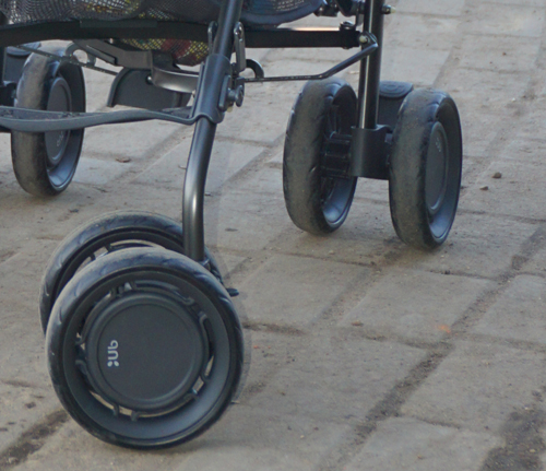 Мы прошлись по всем нашим обычным злачным местам маршрутам с магазинами, пандусами, везде коляска заехала, везде проехала. Очень легко управляется, полагаю, за счет сдвоенных колес: