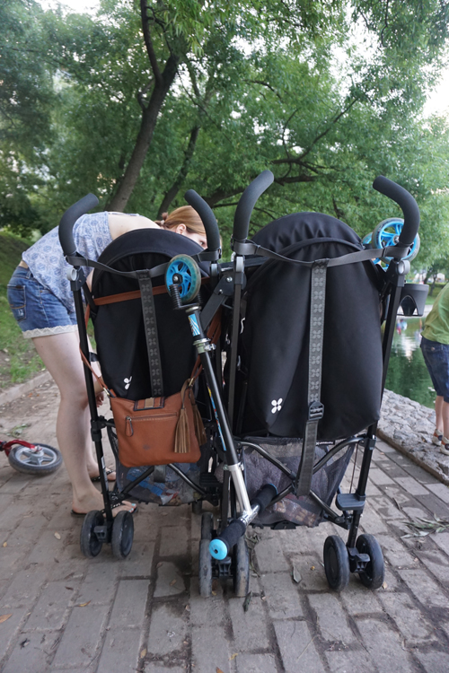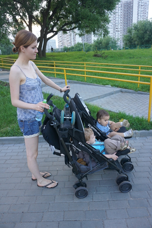 Неожиданное открытие. Во время прогулки с обладательницей такой же коляски и четырех чудесных деток, Леноркой, мы обнаружили что коляски можно сцепить колесами и спокойно вести двух деток сразу! :)