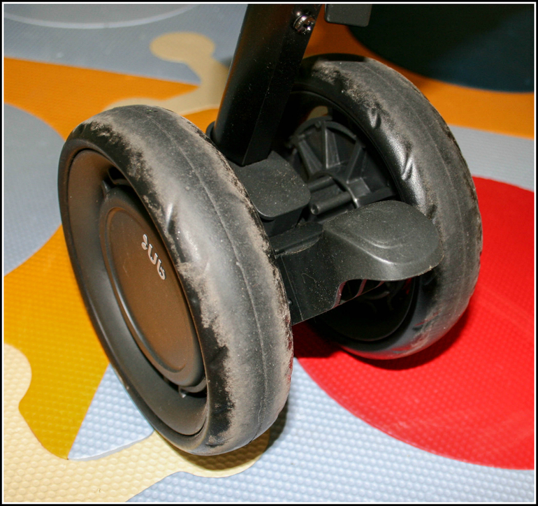 Колеса большие, 15 см диаметром. Обеспечивают хорошую проходимость по неровностям. Но для снега, особенно свежевыпавшего, мне кажется, парные колеса мало пригодны. Покрытие колес - вспененная резина. Пока она прекрасно сглаживает тряску неровностей, но со временем может укататься и плохо исполнять свои функции.