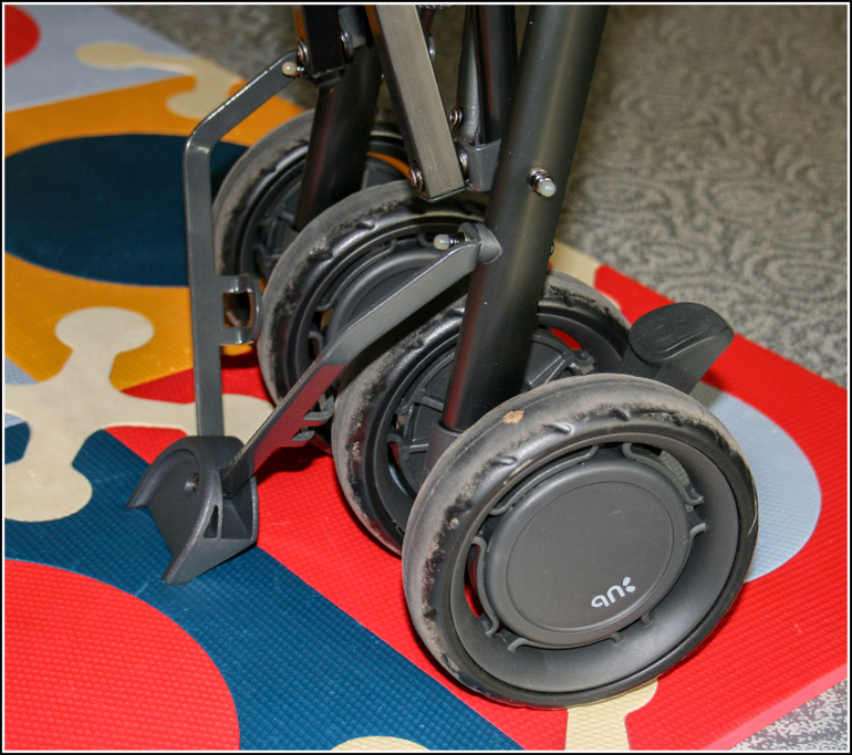 Передние колеса без усилий снимаются с нижней стороны, придавая сложенной коляске еще большую компактность. Задние тоже можно снять, но этот процесс чуть сложнее.