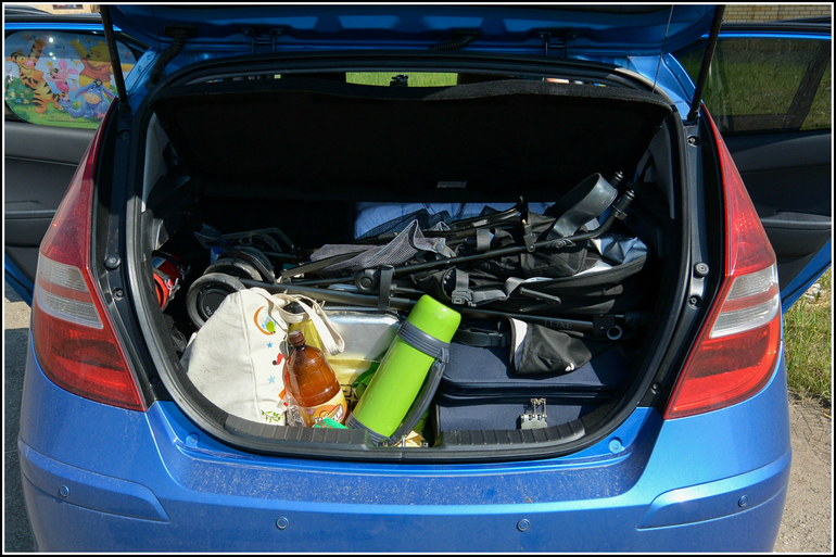 Машинка у нас маленькая. Ну не то чтобы совсем маленькая, скромная - Hyundai i30. В путешествие была забита вещами почти под потолок, но место для коляски все же нашлось, благодаря съемным колесам. Пакета для них не нашлось, поэтому изрядно попачкалось содержимое багажника.