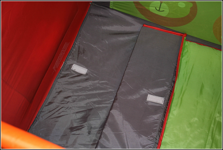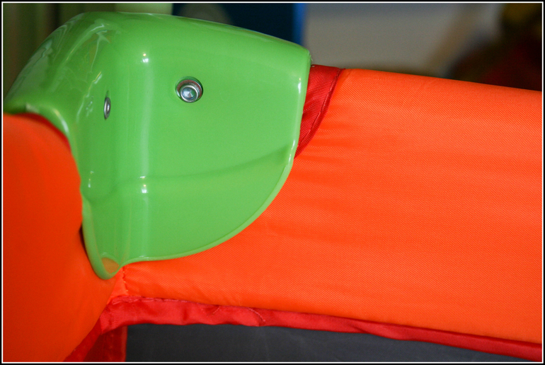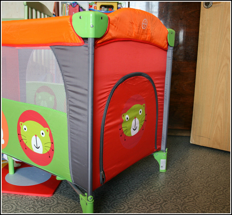 С обратно стороны лаз на молнии. Ох, уж сколько всякого я начиталась про эти лазы в отзывах. Не понимаю зачем люди пишут неправду или намеренно хотят показать себя дураками... или мне так везет. В общем, почти через отзыв пишут, что ребенок расстегивает молнию самостоятельно изнутри и тех, кто использует манеж как ограничитель движения ребенка, это неописуемо бесит. Первым делом после покупки мы с Даником стали проверять этот факт. 100% заявляю вам, дорогие читатели, что открыть плотно и максимально до конца закрытую молнию на ткани под большим натяжением изнутри НЕВОЗМОЖНО!!!! Это просто нереально и противоречит физике работы молнии. А вот если мама оставила своему чаду дырку размером с руку (как на фото ниже), то это уже проблемы мамы, а не девайса. Но даже при такой дырке взрослому человеку придется изрядно поковыряться, что уж говорить о ребенке до 1,5 лет. Ни я, ни Пряник, ни наш папа так и не смогли открыть ее как пишут в отзывах "подцепив пальцем изнутри". Поэтому смело рекомендую эту кроватку как домашний или уличный манеж для малышей, чье пространство в целях безопасности временно надо ограничить.