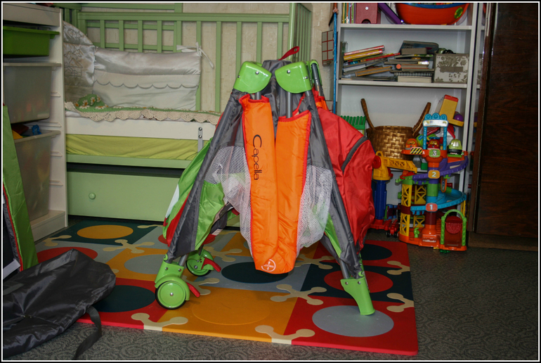 Со стороны кармана кроватка-манеж оснащена колесиками со стопорами. При покупке я приняла их как факт, т.к. причин их использовать в моей фантазии не родилось. Но как только мы приехали в Азнакаево, где кроватку пришлось на дневной сон ставить в отдельную комнату, а на ночь с нами, я оценила всю их прелесть. Его Величество не возжелал спать отдельно от родителей. Впрочем, заниматься приучением тогда мне хотелось меньше всего. Колеса достаточно большие и крепкие, тихие, покрыты резиной. Чудесно едут вместе с 13килограммовым соней)))