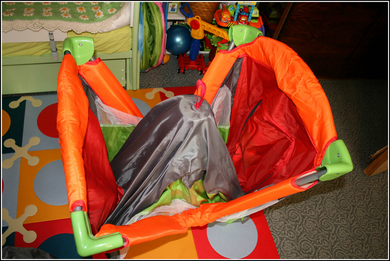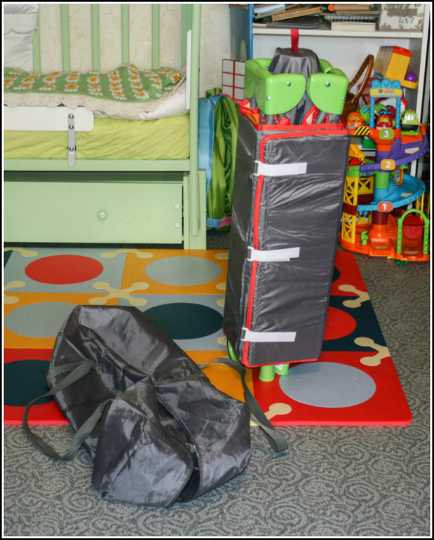 Внутри нее кроватка сложена и обрамлена складным матрасом, который сворачивается "улиточкой". Липучки приходится затягивать довольно сильно, и для этого они пришиты крепко именно с расчетом на усилие.