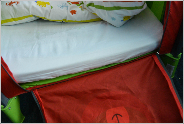 С одной из торцевых сторон находится вместительный карман на резинке, в который влезает и чехол (конечно вывернутый наизнанку, т.к. кроватку везде ставят), москитная сетка, подгузники, пижама, книжка, игрушка и, наверное, можно впихнуть еще много чего нужного...