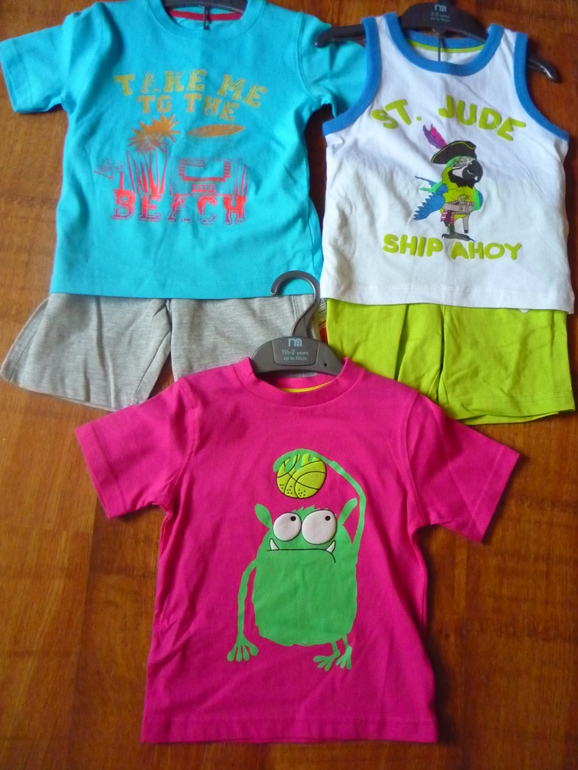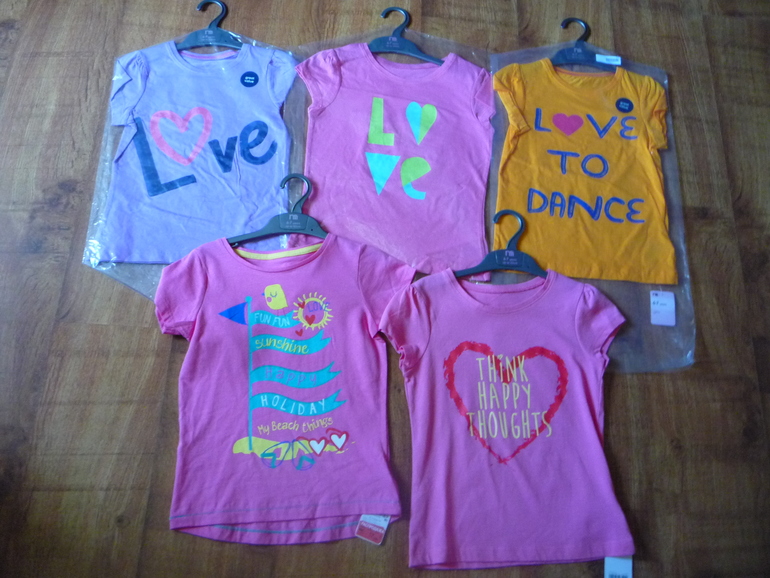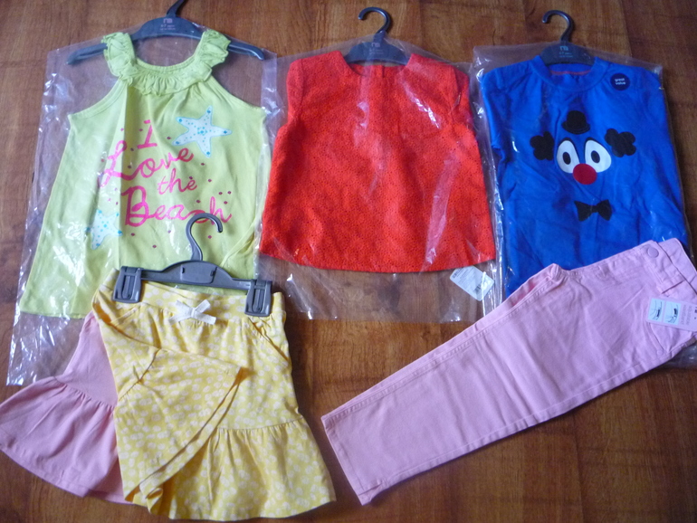 желтая майка для девочки 6-7 209р,блузка оранжевая 6-7 359р,синяя футболочка на мальчика 6-7 149р,комплект юбочек 6-7 359р,розовые капри 8-9 389р
