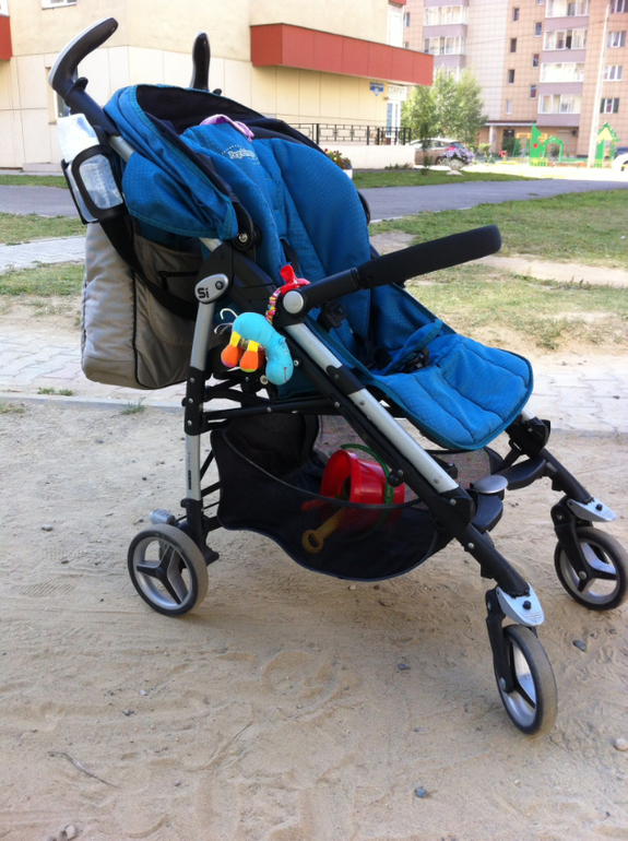 Летом она жила в машине, пользовалась ей , когда ездили гулять с дочей далеко от дома, к бабушке, на даче.... И минусы конечно почувствовались быстро. Первое, что меня н радовало, она дребезжит по дороге, даже по почти ровной, не сильно страшно, но как оо не очень, проехать по не асфальтированной дороге можно, но понятно без удовольствия) ребенок засыпал, я начинала раскладывать спинку, она раскладывалась рывком, потом привыкла и придерживала ее коленкой, что тоже не очень удобно. В положении лежа кап не спасал ребенка от солнца совсем! Приходилось наматывать палантин. Чехла на ноги нет, правда к й отлично подошел чехол от нашей первой коляски. Дождевика тоже нет и у меня не доходили руки найти дождевик на трость....