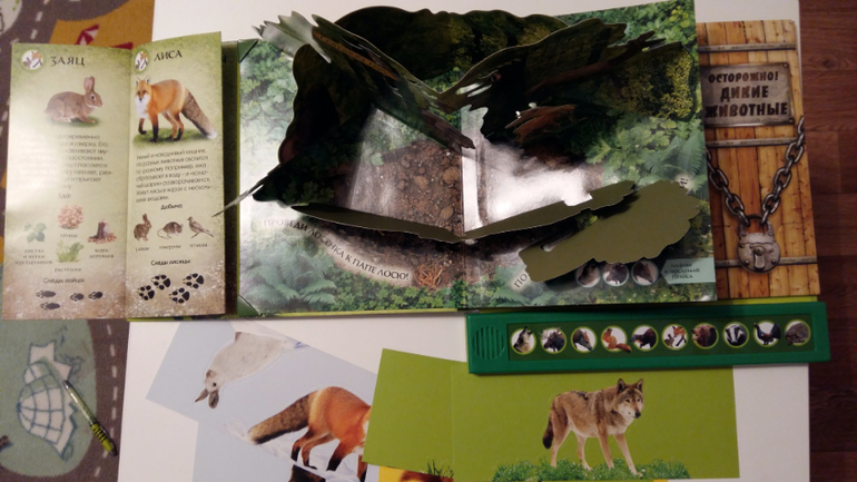 Книжка очень классная,да еще и по такой цене.В книге есть еще и звуки, и карточки с животными, и маленькая книжка.Каждый разворот это время года.Советую!!!