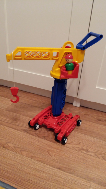 Кран очень понравился. Устоичевый,прочный,яркий. Человечик вынимается,лебедка крутится.