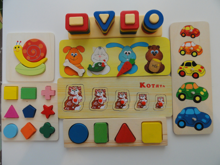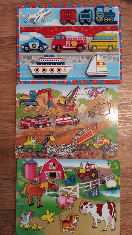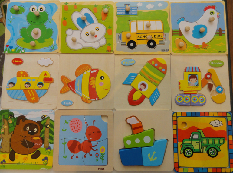 Начну с пазлов.У нас вот такие простенькие,собираем с года.Именно с них у ребенка началась любовь к пазлам.Сейчас у нас посложнее,но они картонные и поэтому в этот пост не вошли.