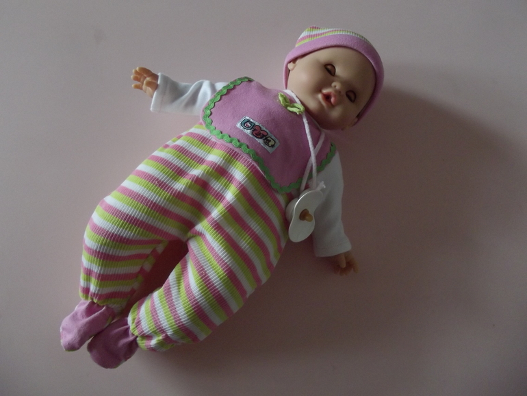 Кукла озвучена . Если вынуть пустышку то плачет и зовет маму - папу . Выключается после третьего плача или если дать пустышку.