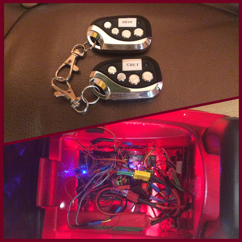 Свет и звук запускаются с двух брелоков. А провода спрятаны в богажник.