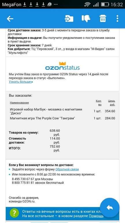 да, в озоне можно отказаться от части заказа. давайте номер, смотрю желающх на магбук все равно не нашлось.. а уже забирать можно? до воскресенья успею? я просто раньше очень вряд ли смогу.