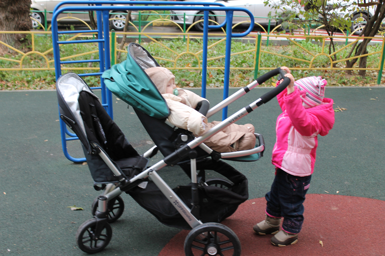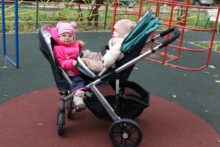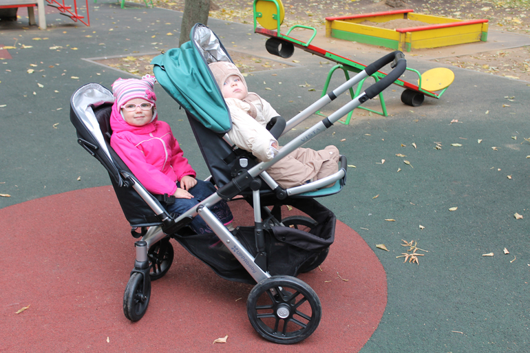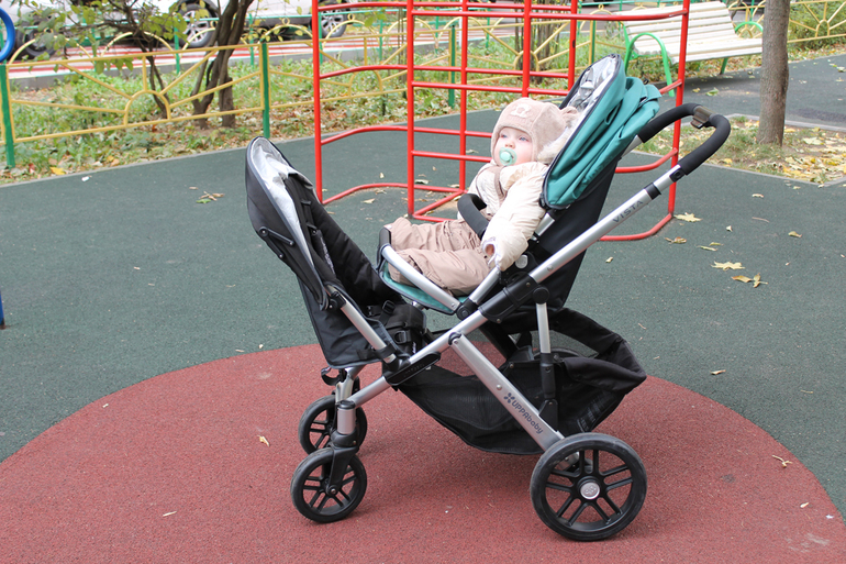 Да, у этой коляски имеется возможность установки дополнительного сидения! Поэтому подруге не пришлось вытаскивать свою коляску, а детям очень понравилось кататься вместе. Сидения устанавливаются либо лицом друг к другу (но такое положение мне не очень понравилось, потому что между сидениями довольно мало места и сидящий выше испачкает или заденет ногами сидящего ниже), либо по ходу движения «паровозиком».Далее показываю все возможные положения установки и посадки.