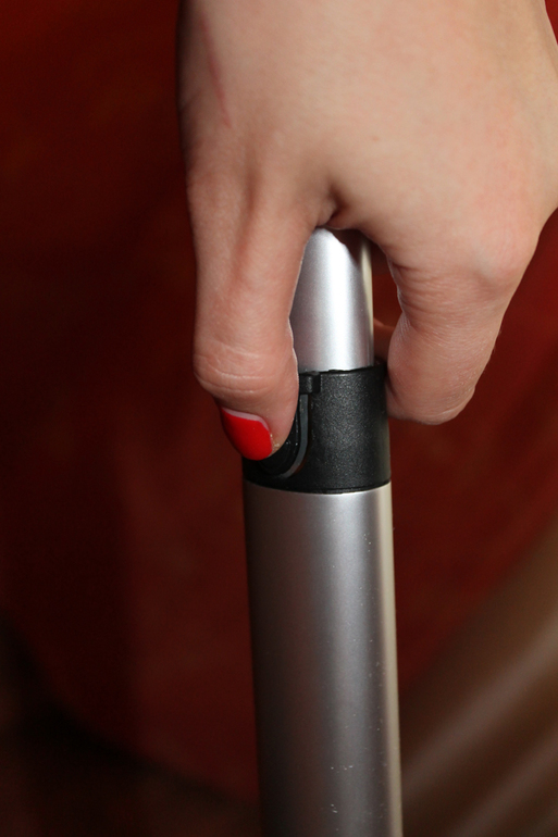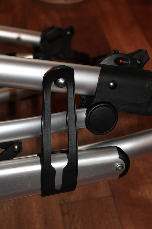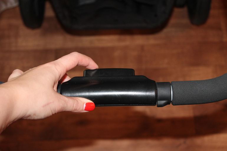 Пару слов о ручке коляски. Во-первых, она цельная телескопическая, а я вообще не люблю разъемные ручки. Во-вторых она удлиняется, что совсем немаловажно при моем росте 177см (без каблуков). Это делается очень легко и просто, прямо на ходу, нажатием кнопки, которая расположена в центре ручки.