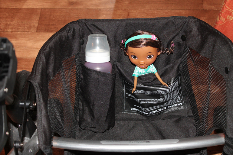 В самой корзине есть два кармашка. Один для детской бутылочки или бутылки (с водой, разумеется))), а второй - для мелочей.