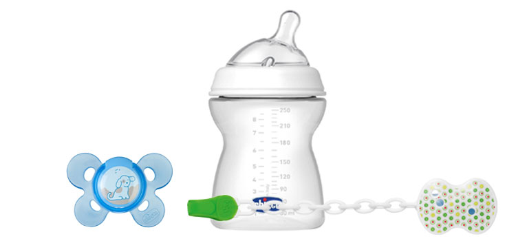 Набор для грудничка Chicco: бутылка Natural Feeling + пустышка + прищепка к пустышке.