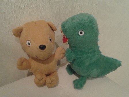 Фото не очень удачно в плане цветопередачи, в реальности цвета яркие и насыщенные. Вот такая парочка - Тедди и мистер Динозавр: