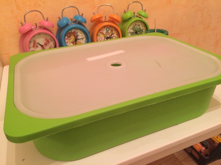 Мы играем на полу, на клеенке, уборка конечно после него, мама дорогая, и поэтому чаще посещает мысль купить побольше контейнер с низкими бортами, и как раз туда все 5 ухнуть.