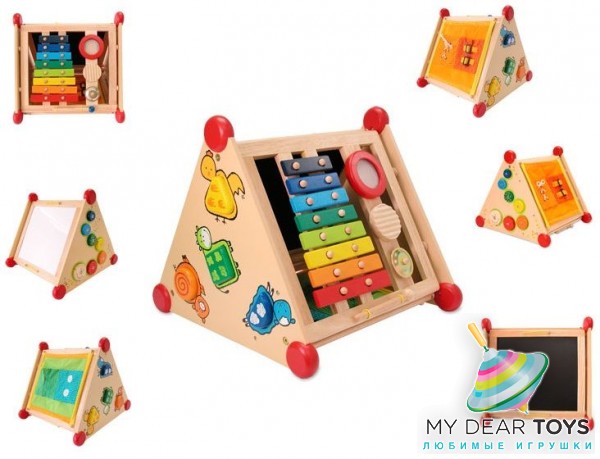 у нас треугольник им той,купили тоже на год,честно изо всего играли только в боковые магниты,летом когда появились мелки (нам было год и три) рисовали на черной стороне,а потом всё,стояла без дела,мы ее отдали постарше ребенку ему два,тоже один два дня поковырял пуговки,магнитики и всё,вернули,сейчас на балконе живёт,поэтому я бы взяла дом там и сортер и лабиринтик с бусинами мы в них играем но в отдельном виде!Но это наш опыт,может кому и понравилось