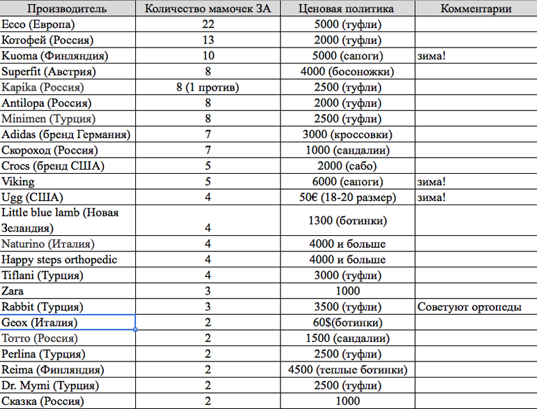 Детская обувьДевочки, в этом посте я спрашивала вас про производителей обуви для деток, также еще спросила у мамочек в инстаграмм (@aleksandraserg) . Составила сводную табличку, кому интересно, прошу)