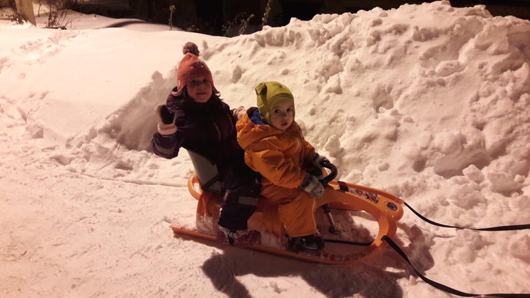 - снегокаты после долгих раздумий тоже пришлось отмести - даже длинные, чтобы оба вмещались, и даже со спинкой (хотя они как раз не особо длинные), потому что Ромка на нем пока все-таки не удерживался бы... если сажать его за руль всегда, дочке обидно будет, да и непонятно, насколько крепко он держаться будет в толстых варежках. и Алинке, сидя сзади, его еще не поддержать толком: сама небольшая :) а если сажать Ромку сзади, то поддержки даже потенциальной спинки не хватит на то, чтобы предотвратить падение набок (она же без закругления). а катать снегокат как хрустальную вазу и бдить, чтобы сын не кувыркнулся, тоже не хотелось :)