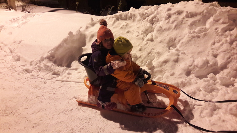 Расконсервировали санки, дети по-прежнему вмещаются без проблем и в любом порядке. Спинку пока снимать не стала, места и так хватает, да и мне спокойнее, что никто там сзади с санок не свалился)))