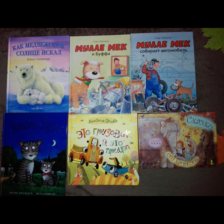 Дональдсон конечно поздновато прикупила, но пусть будет) книги типа виммельбухов у нас не очень идут( где надо на картинке что-то найти. Книжку "Грузовик и прицеп" сын 2 недели из рук не выпускал, по 20 раз читала. Хотя когда открыла, думала, что это для совсем маленьких, гуси га-га-га, коровы му-у и т.д. Сразу проследилась линия гркзовик-мама, прицеп-ребенок. Теперь мучает меня Мулле Меком, тоже по 5 раз в день читаем. И медвежонок, который солнце искал очень понравился. Несколько сказок из книжки от капризов понравились, просит их читать. Ходит постоянно что-то цитирует нам, так смешно)