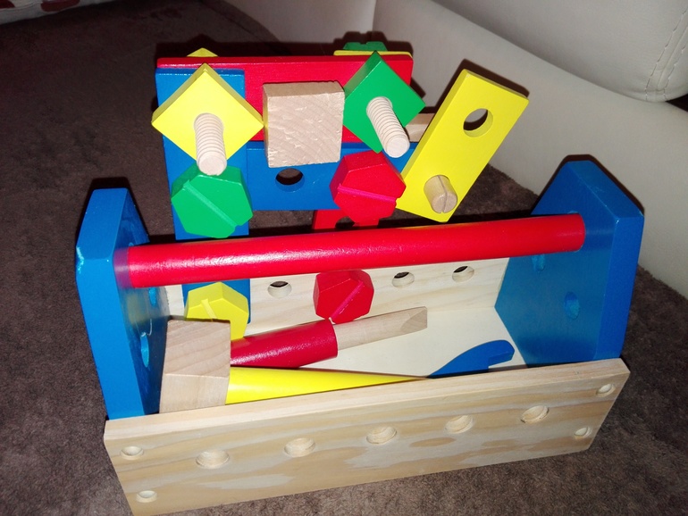 Подарили родственники. Не очень прониклись, если честно. Когда деревянным молотком долбит по деревянным гвоздям, звон стоит на всю квартиру. И когда промахивается, все-таки больно получается. Очень туго гвозди заходят, в общем, пока не играем практически. Есть пластиковый набор из икеа. Мне он больше по душе, хотя там деталек мало и ничего скрепить не получится, зато легкие пластиковые предметы.