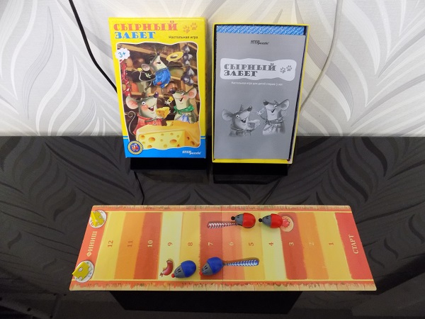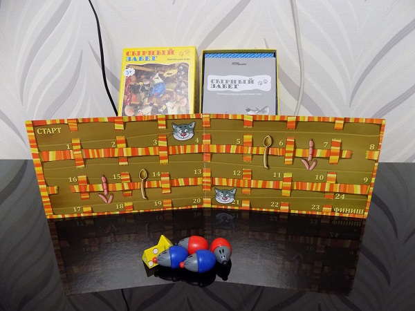 У этой игры также есть аналог - Морковные гонки. Игровое поле картон, мышки и сыр деревянные.