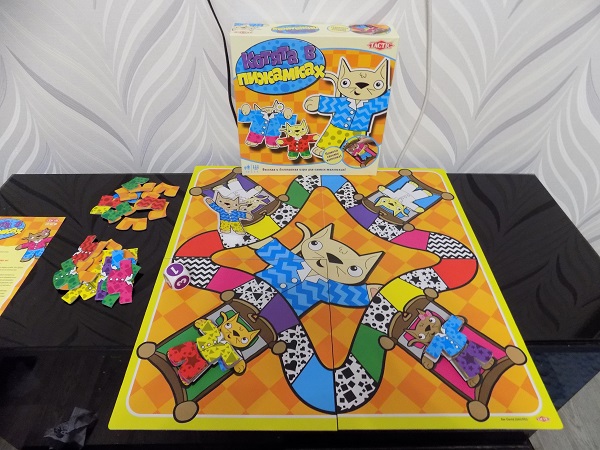 Игра очень похожа на Колораму, как не странно. Тут тоже надо искать совпадение цвета и формы. Перемешиваем по отдельности верхнюю и нижнюю часть пижамок и раздаем по 5 штук каждому игроку. Розданные элементы складываются стопкой на изображение выбранного котенка по краям игрового поля. Ставим фигурку Кота на подставке в любое место игрового поля и кидаем кубик. Перемещаем Кота на то количество шагов, которое выпало на кубике. А дальше все игроки смотрят на свои комплекты пижам. Если рисунок или фигура совпали то можно снять эту деталь и отложить в сторону. Когда все игроки сняли совпадающие детали ход переходит к другому игроку. Выигрывает игрок первый убравший все детали со своего котенка.