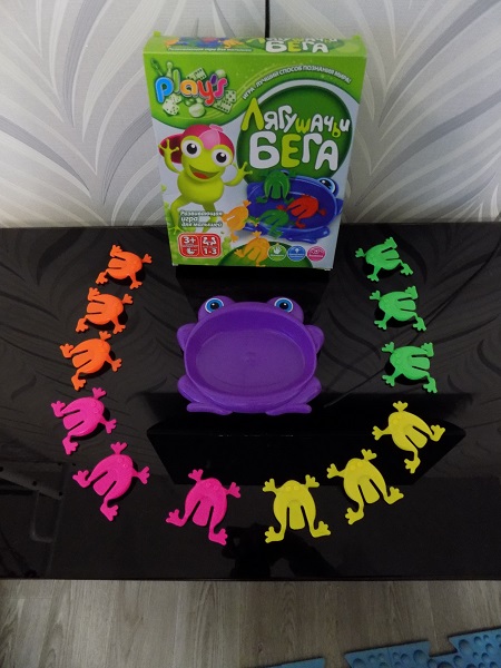 Довольно азартная игра. В моем детстве была похожая. Но вот сами лягушки мне не понравились, пластик тонкий и прыгают плоховато. У нас есть другие, вот ими прыгать одно удовольствие. Задача проста - попасть в "корытце" как можно большим количеством лягушек одного цвета.