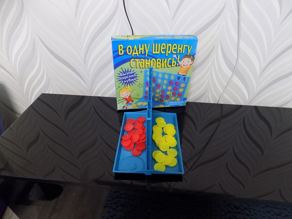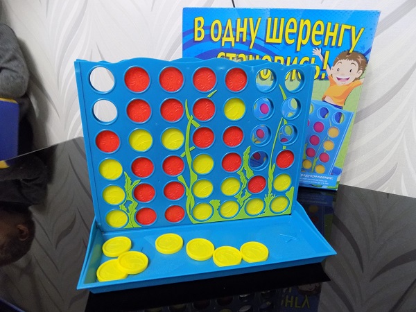 Цель игры: создать на игровом поле дорожку из 4 фишек одного цвета подряд по горизонтали, вертикали или диагонали. С диагональю у нас плохо, а вот остальные два понятия уже доступны, правда все равно приходится подсказывать. Игра на все возраста.