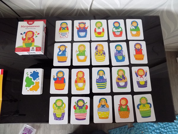 Интересная и забавная игра, возраст указан 4+. Собственно правила просты. Из стопки с красками берется одна карта и показывается игрокам. Кто быстрее найдет это сочетание на поле с матрешками и повторит движение, которое показывает матрешка, тот выиграл раунд.