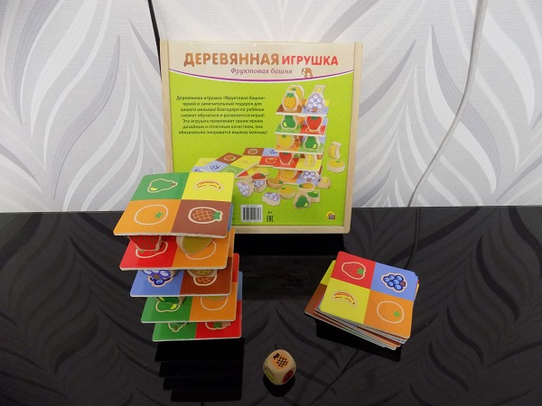 Игра на ловкость. Строим башню из пластин и фигурок с изображением фруктов. Потом бросаем кубик и аккуратно вынимаем из любого уровня постройки фрукт выпавший на кубике. Сделать это надо так, чтобы башня не упала. Ребенок игру не любит, потому что башня неизменно рушится. ))